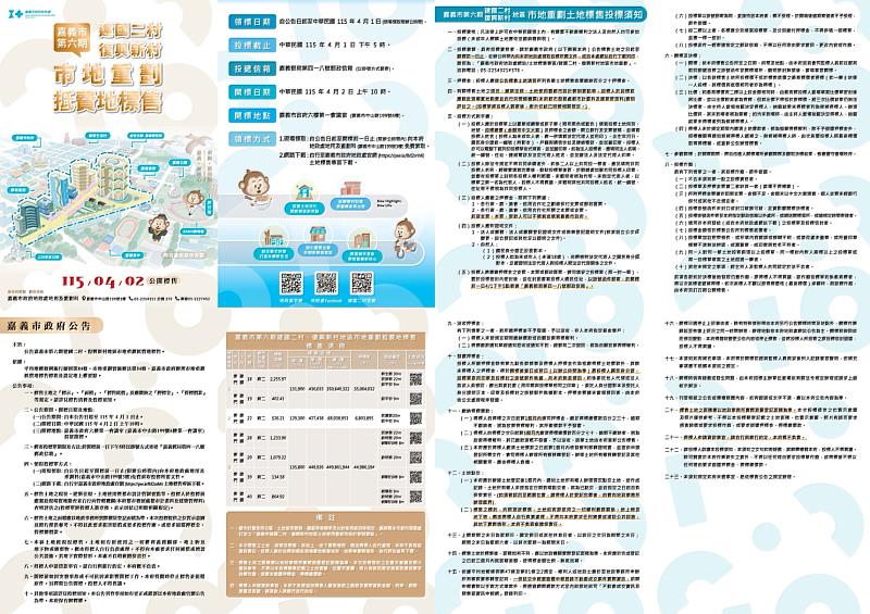 (中央社訊息服務20260224 10:41:15) 眾所矚目的「嘉義市建國二村、復興新村地區市地重劃抵費地標售」正式啟動,嘉義市政府將於115年2月25日公告標售,並訂於115年4月2日上午10點在市府6樓第1會議室辦理公開開標,市府歡迎有意投標民眾踴躍參與。